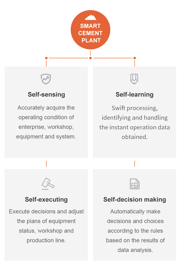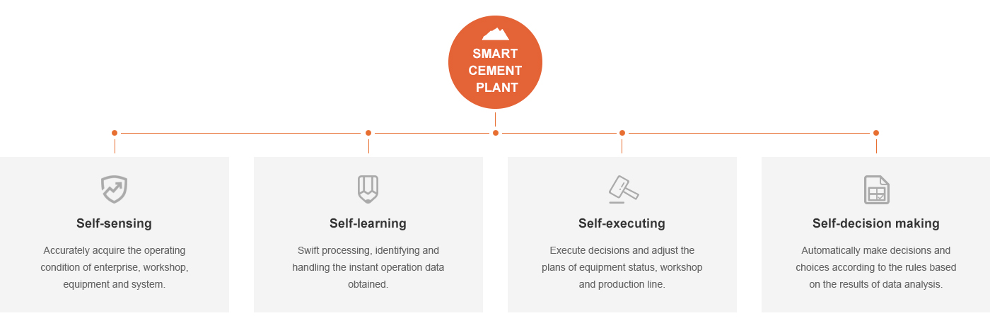 Smart cement plant is set to cover every corner of cement production operation, including information exchange, transfer, handling and seamless smart integration, from product design to sales, from equipment control to company resources management. Its construction start from smart planning, including smart control, production, logistic, management, analysis and services, to achieve smart manufacturing.